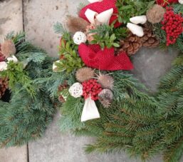 Na dušičky navazují vánoční výrobky. Jsou to věnce adventní i na dveře, košíčky, misky, svícny, kapličky, vánoční stromečky na hroby i na stůl. Již od února prodej petrklíčů.